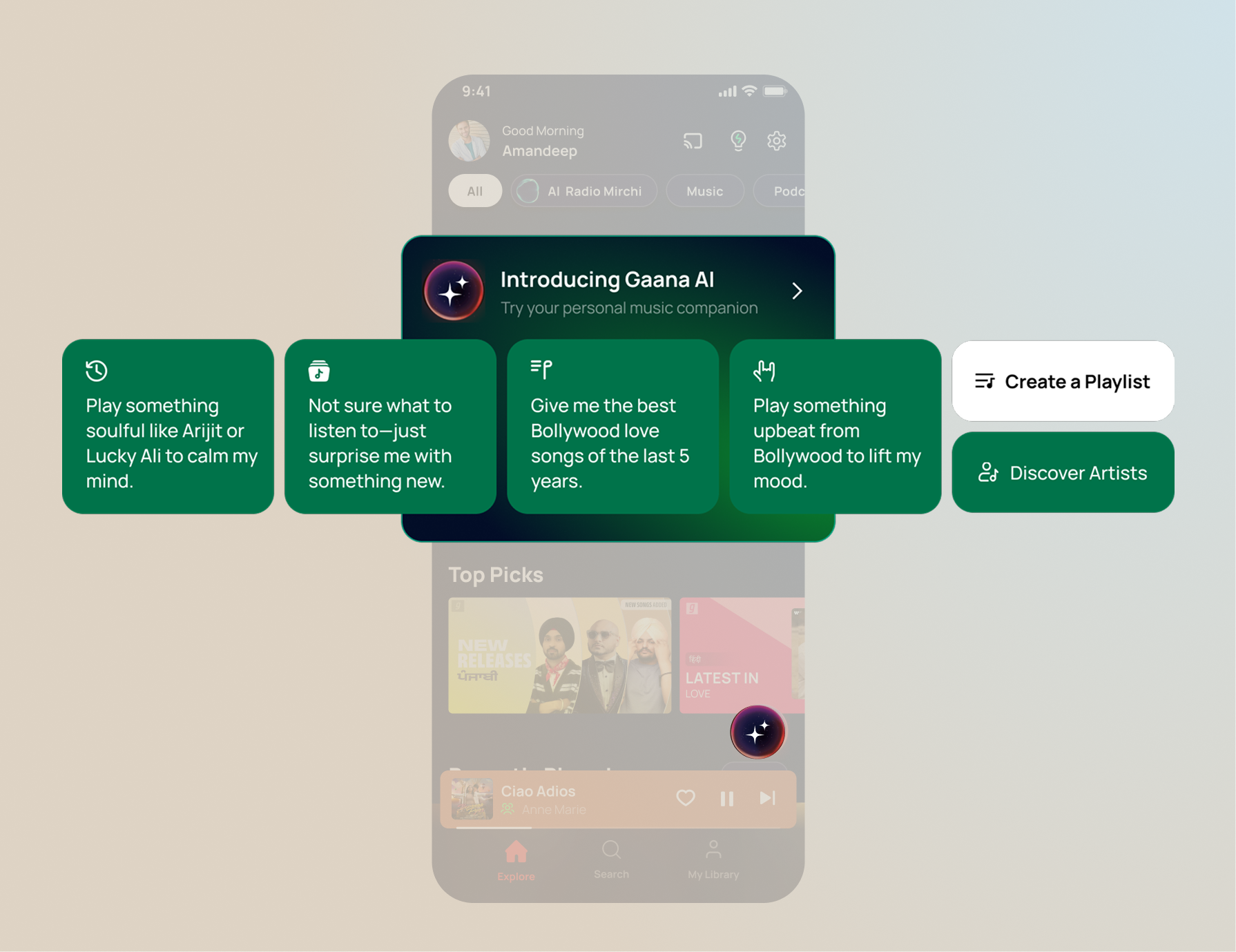 Dedicated AI Library: A new section in the Library tab called "My AI Stations" houses all user-created and suggested Gaana AI Radios, giving them a permanent home.