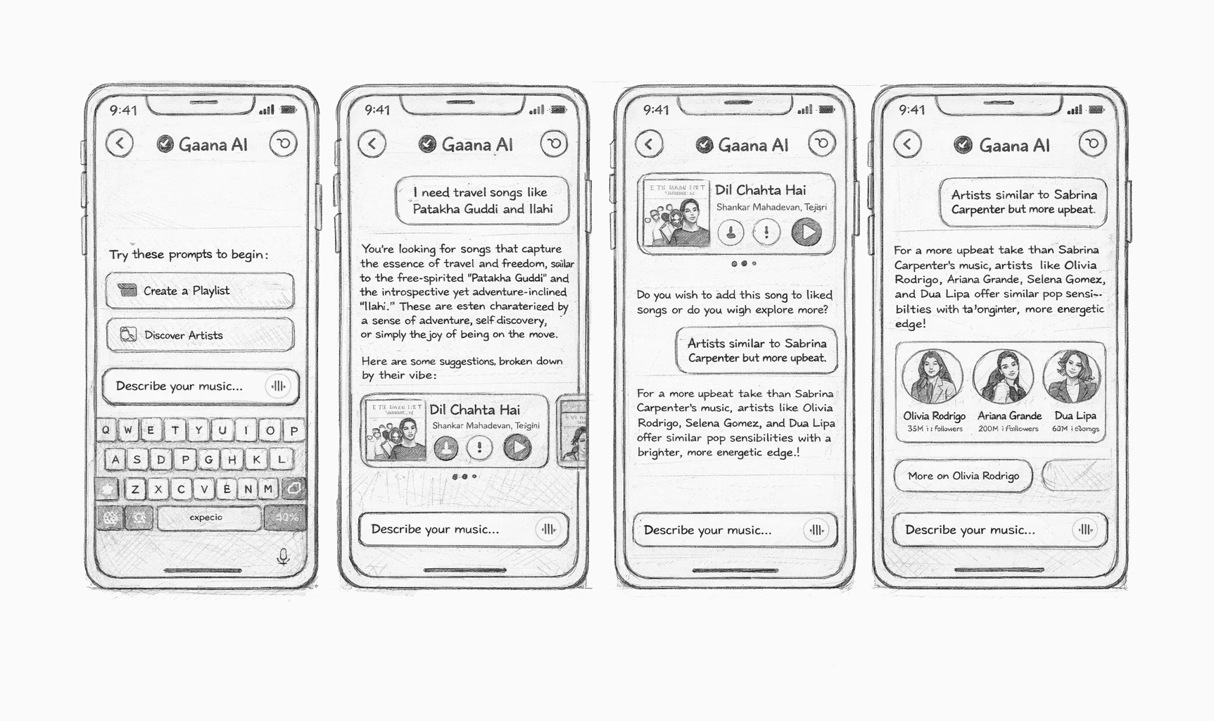C. The Conversational Interface: The chat UI uses bubbles, with Gaana AI's responses providing not just answers but tappable actions (e.g., "Playing 'Lut Gaye'... Want to know the story behind this track?").