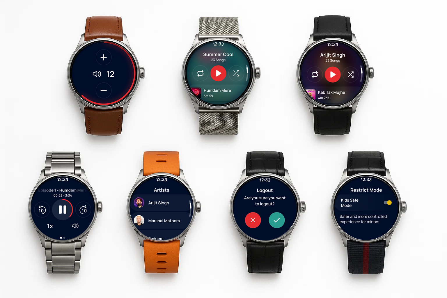 Visuals: Key frames of the watch app UI showing the now-playing screen, voice search activation, and offline library.