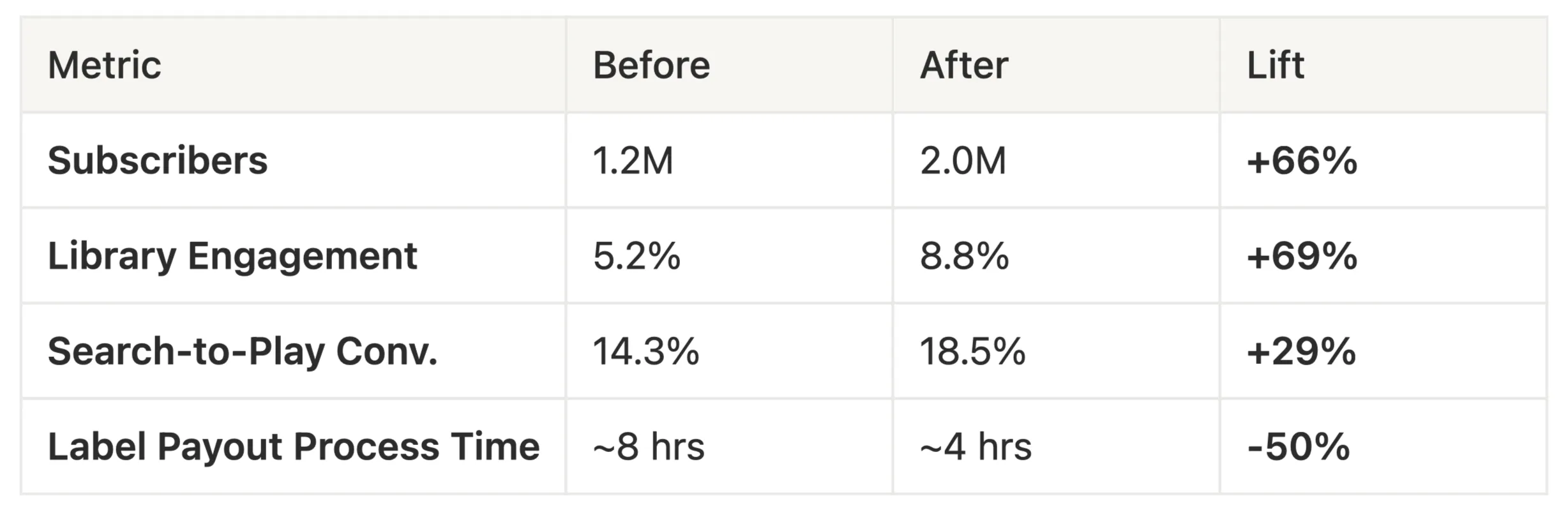 Outcome: Drove mobile engagement lifts: Library +69%, Search-to-Play +29%. Grew subscribers from 1.2M to 2.0M (+66%). Successfully launched the TV app and designed for in-car infotainment, while building a dashboard that reduced label payout processing time by 50%.